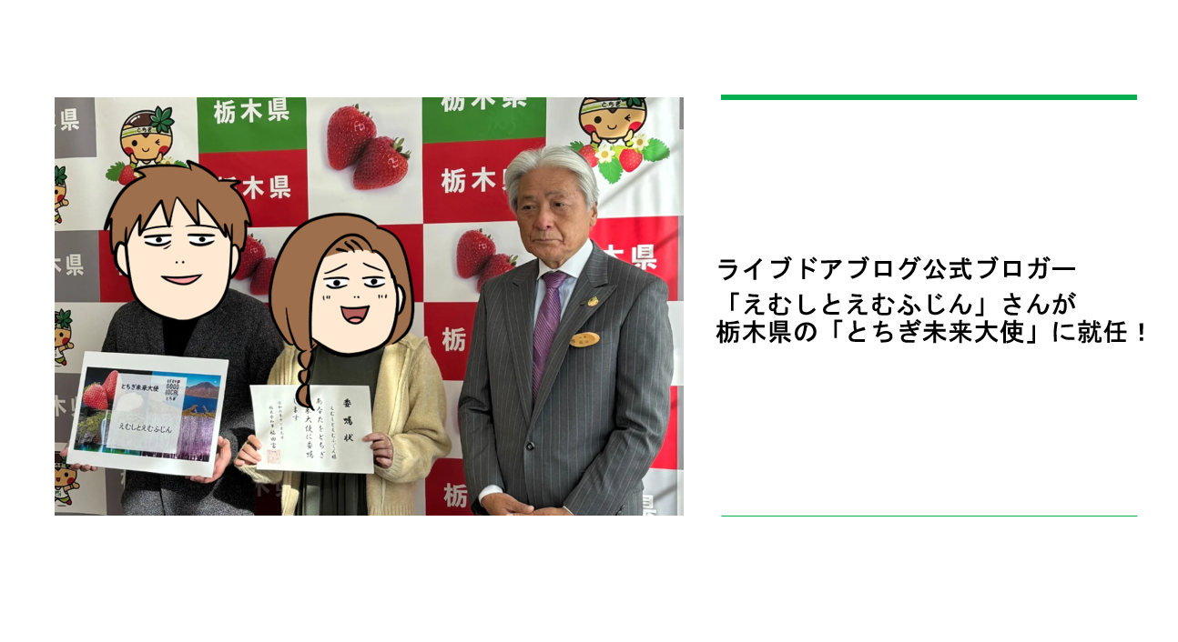株式会社ライブドア(以下「当社」、本社:東京都港区、代表取締役社長 兼 COO:宮本 直人)は、当社が運営するブログサービス「ライブドアブログ」の公式ブロガー「えむしとえむふじん」さんが、栃木県の「とちぎ未来大使」に就任されたことをお知らせします。